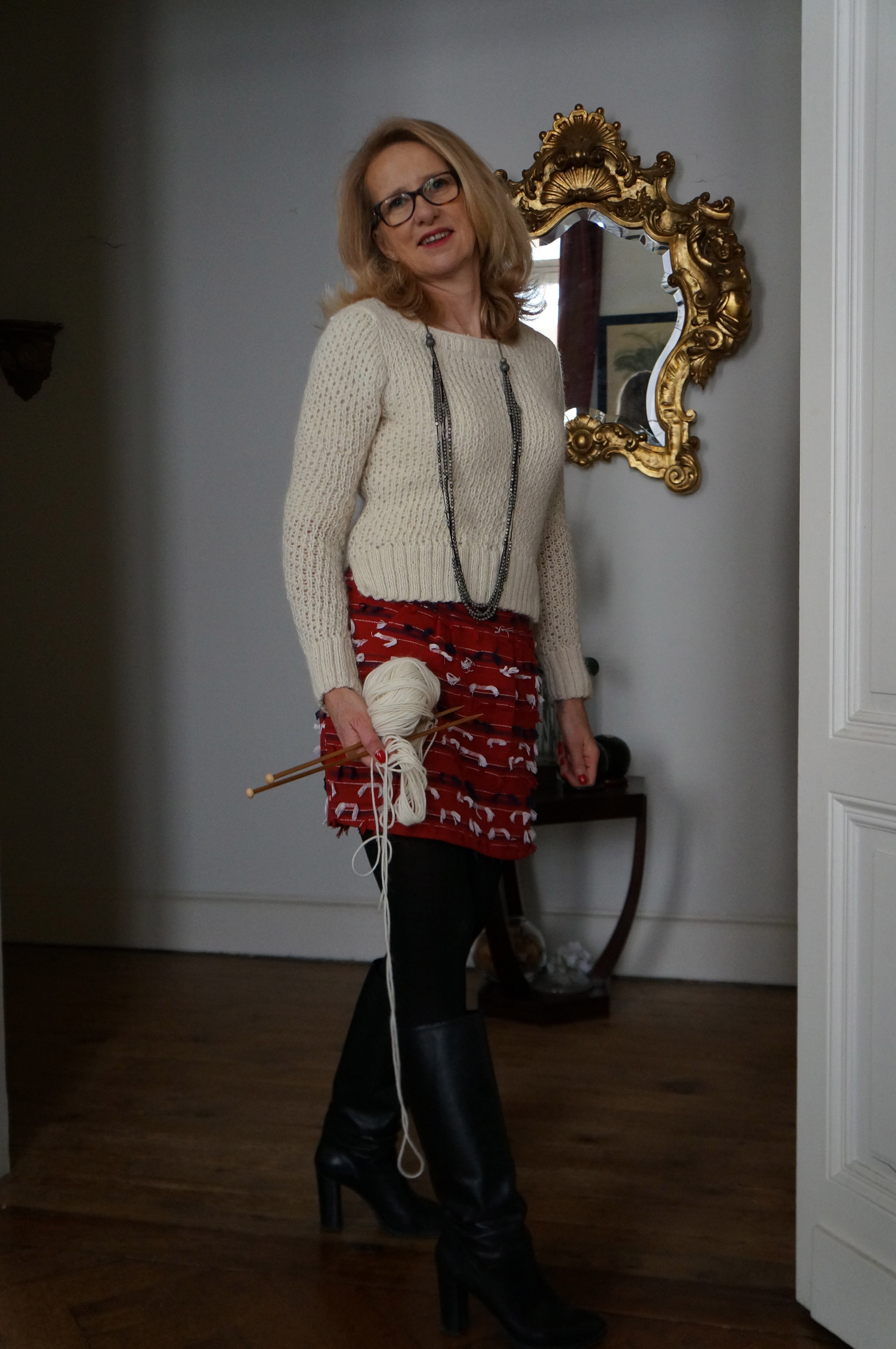 Bravo pour cette reprise du tricot ! Tu as assuré comme un chef !!! Bon choix de laine et du modèle, parfait avec cette jupe. Bisous !