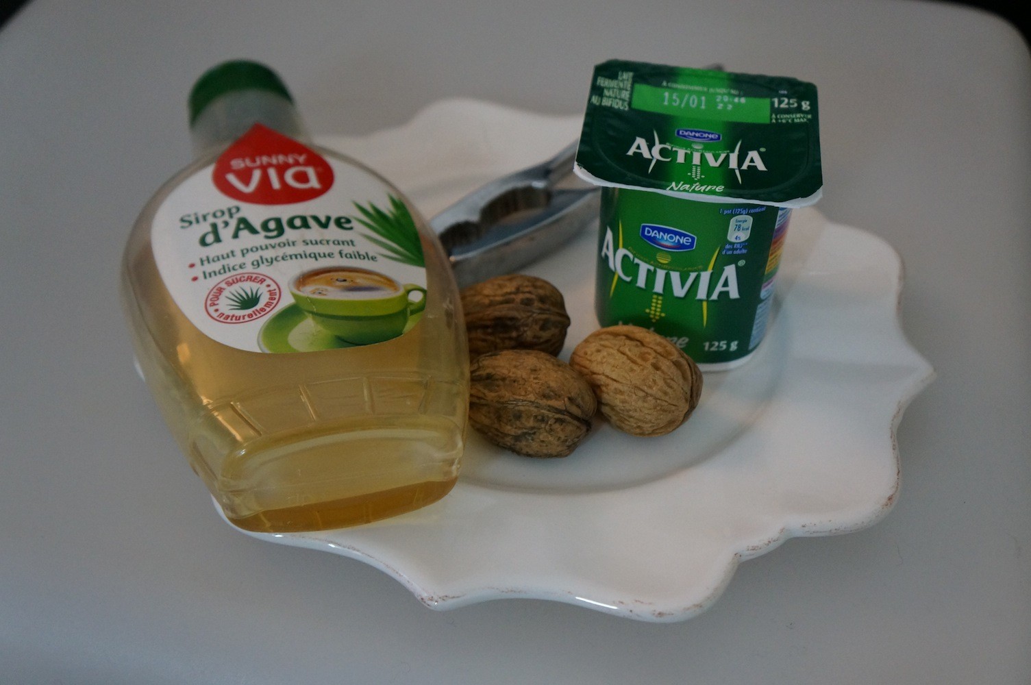 Ajoutez un yaourt nature, deux noix et un peu de sirop d’Agave