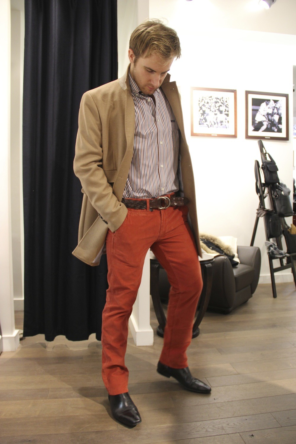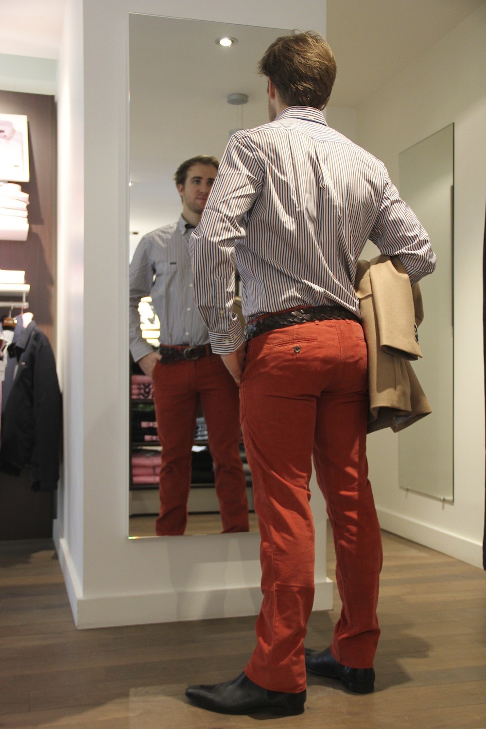 Maxime n’avait pas commencé sa wish-list de Noël, la chose est réparée, avec ce pantalon en velours rouille et la chemise rayure silver ..