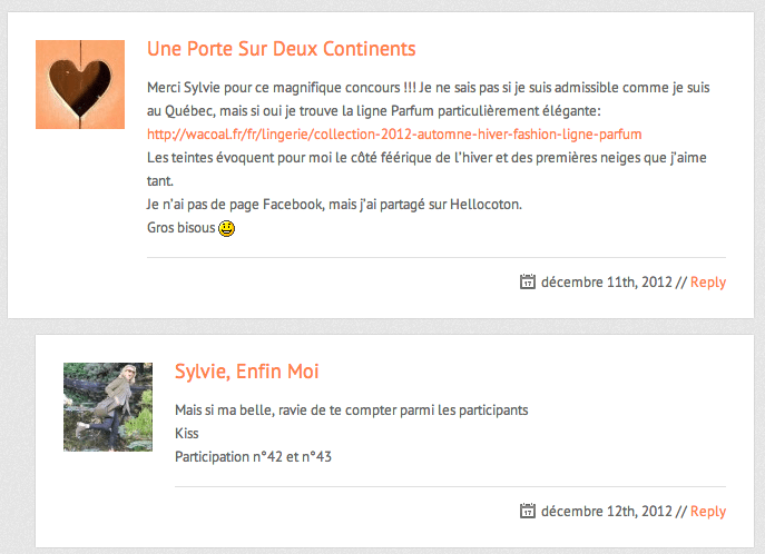 Woww!!!!!!! Je saute de joie !!! Quel beau cadeau de Noël !!!! Merci Sylvie et WACOAL pour ce magnifique concours !!!!!!!!! 🙂 Je suis vraiment ravie d’être la gagnante !!! ♥♥♥♥♥ Ce cadeau est tout simplement ravissant, je suis comblée !!! MERCI 🙂 🙂 🙂