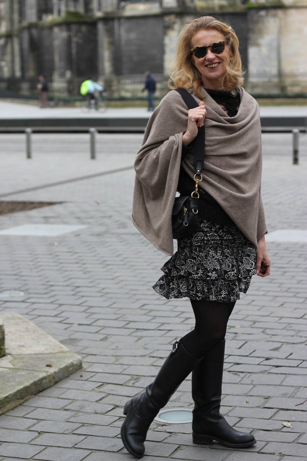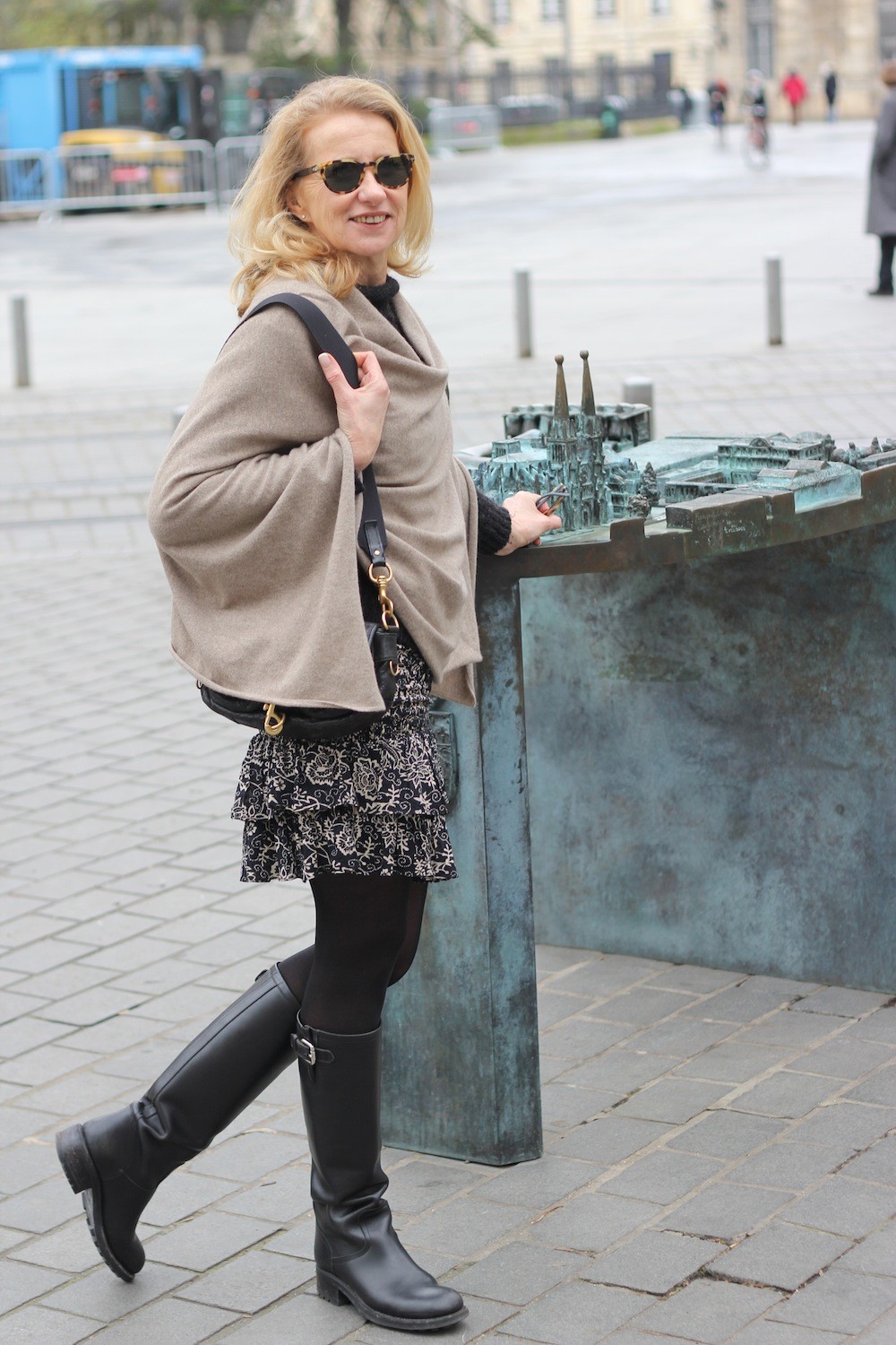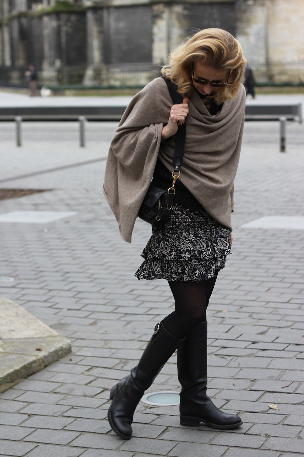 I love your cute outfit, love the poncho, the boots and the skirt and i have a similar bag like yours from Miu-Miu from the same collection.