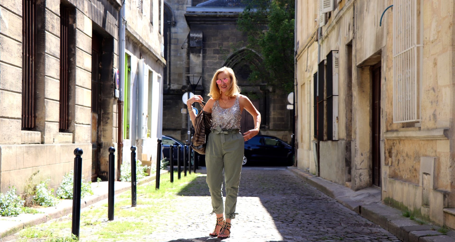 J’aime beaucoup ton top paillette associé à ce pantalon kaki, mille excuses….Vert Tilleul.